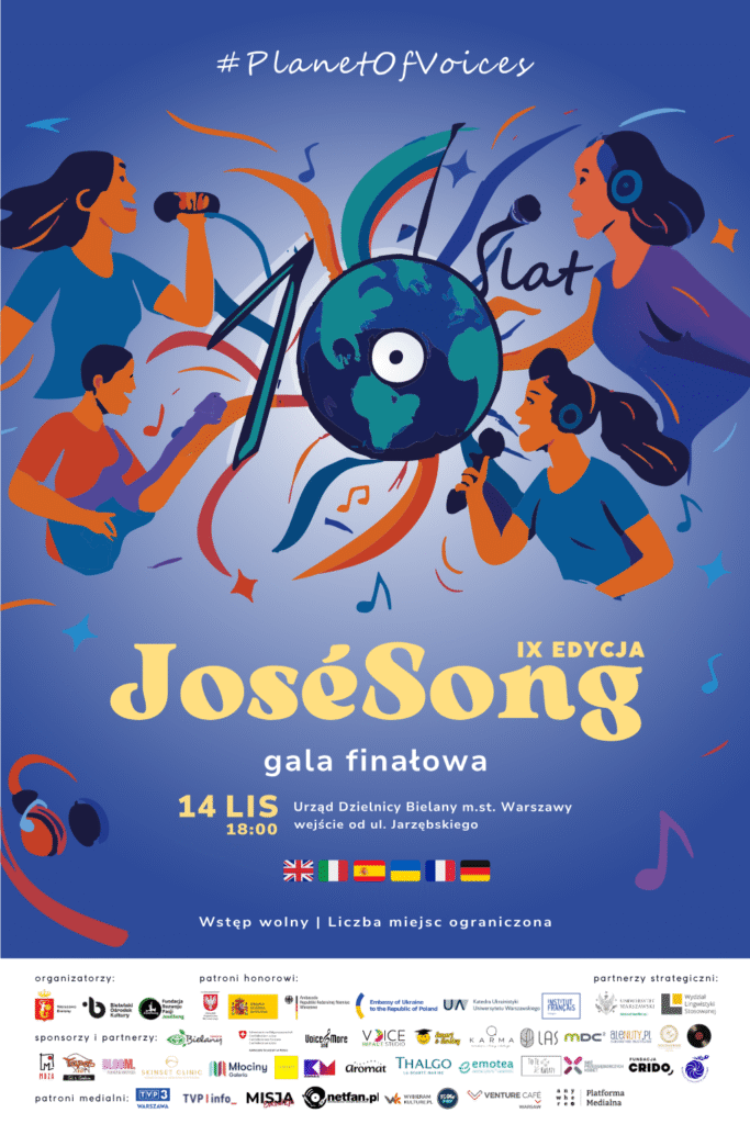 Już od 10 lat Bielany rozbrzmiewają muzyką w wielu językach świata! Zapraszamy na uroczystą galę rozdania nagród Ogólnopolskiego Festiwalu Piosenki Obcojęzycznej JoséSong. Koncert Laureatów i zaproszonych gości odbędzie się 14 listopada 2025 roku o godz. 18:00 w sali widowiskowej Urzędu Dzielnicy Bielany (ul. Żeromskiego 29, wejście od ul. Jarzębskiego). Wstęp wolny – decyduje kolejność przybycia.